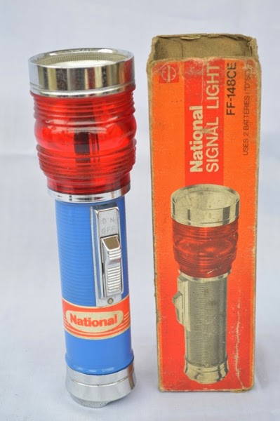 Ini adalah senter jadul National, lengkap dengan lampu sinyal warna merah, buatan Japan lengkap dengan bungkus aslinya. Bahan dari kaleng dan plastik. Menggunakan baterai ukuran D x 2. Kondisi NOS, tutup bungkus ada yang sobek.